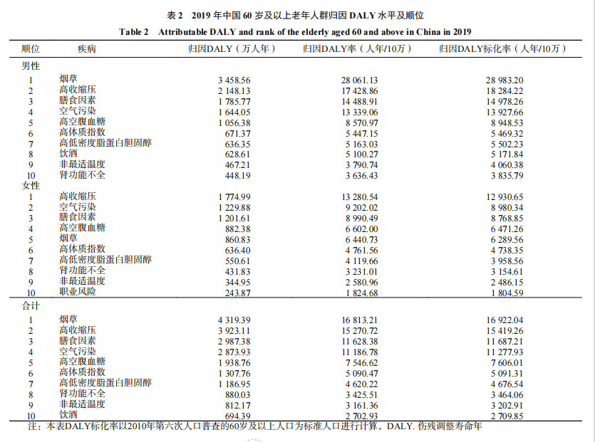 另外,與2009年相比,2019年影響中國60歲及以上老年人群健康的危險因素順序也發(fā)生了變化。其中,膳食因素、高體質(zhì)指數(shù)、腎功能不全和飲酒的順位有所提高,而空氣污染、高低密度脂蛋白膽固醇和非最適溫度的順位出現(xiàn)下降。