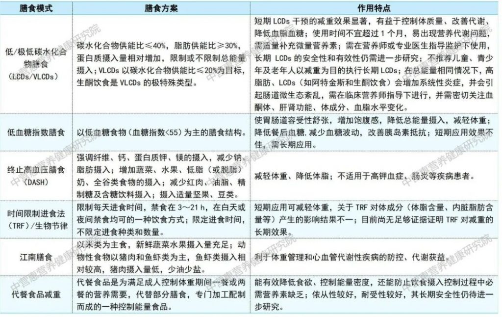 能量平衡是影響體重的關(guān)鍵因素,攝入的能量少于消耗的能量才能實現(xiàn)體重控制的目標(biāo),飲食干預(yù)在其中起著關(guān)鍵作用。飲食干預(yù)通過合理調(diào)整飲食結(jié)構(gòu)和控制能量攝入,幫助人們實現(xiàn)健康的體重管理;且飲食干預(yù)相對容易實施,不需要高昂的費用和復(fù)雜的設(shè)備,人們可以在日常生活中輕松進行。因此,無論是從健康角度還是經(jīng)濟角度考慮,飲食干預(yù)都是一種理想的體重管理方式。以下我們將重點介紹幾種常見的減重膳食模式,并列出其他一些常見的減重膳食模式及特點供大家參考(表1)。